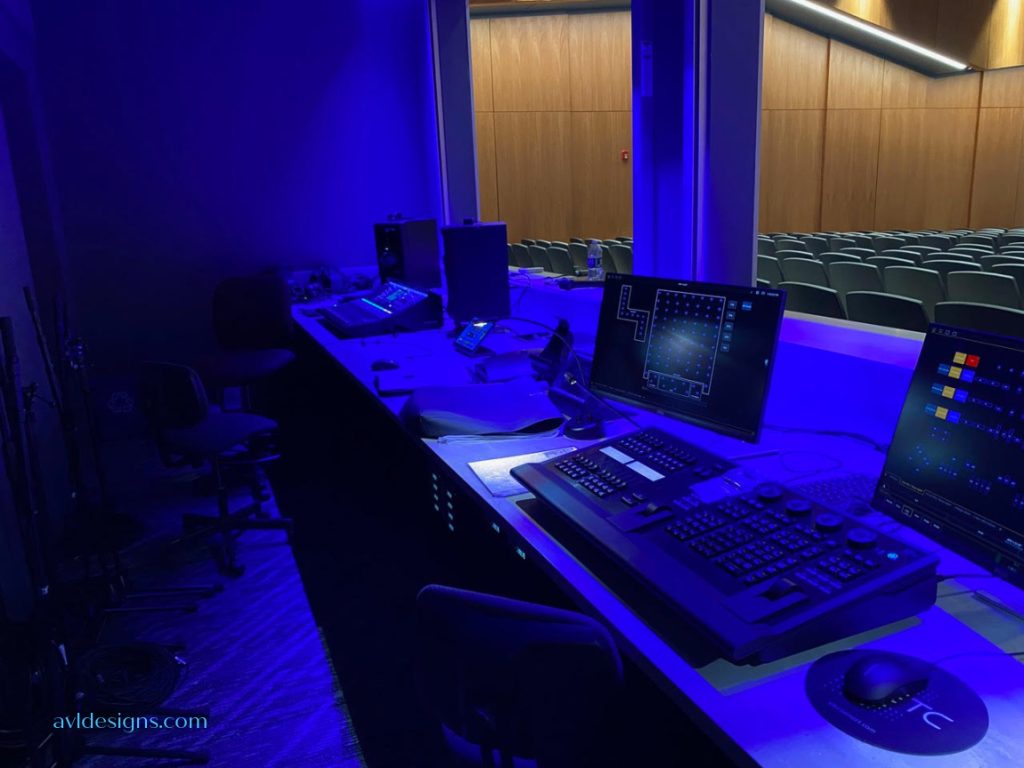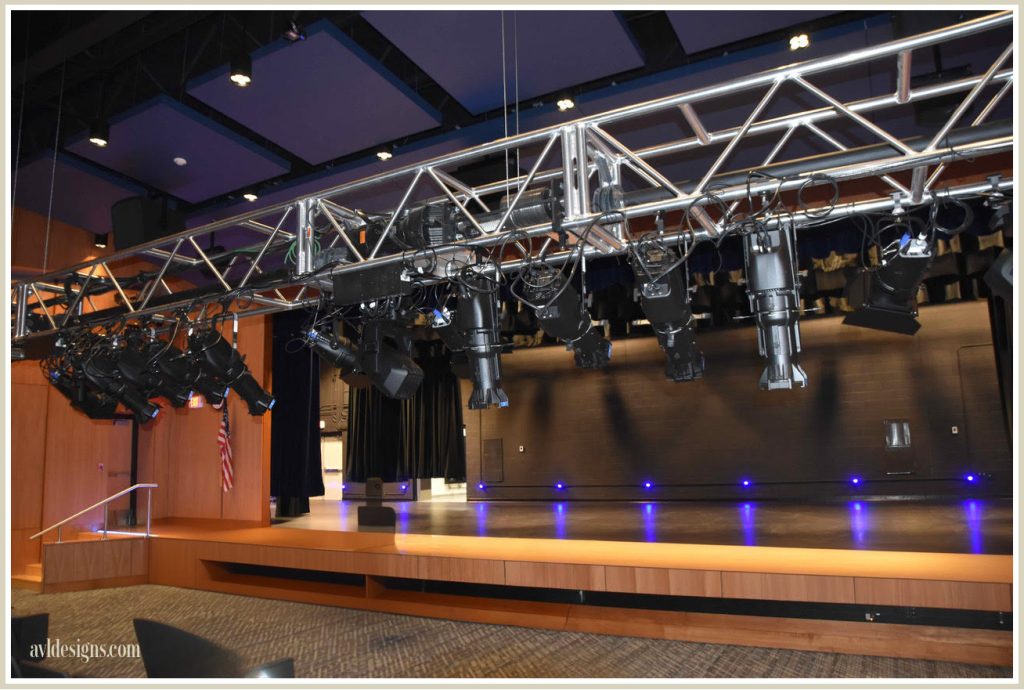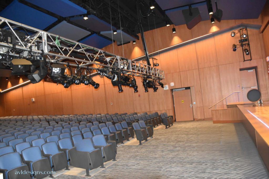 The new lighting system consists of all LED fixtures from ETC, and VariIight. The new audio system includes a digital console from Allen and Heath, loud speakers from Fulcrum Acoustics, control systems from Crestron, wireless microphones from Sennheiser digital, projection from Panasonic, PTZ camera from Panasonic and many other products. The auditorium was just commissioned in the third week of January 2025 and will be put to good use for shows starting in the spring.