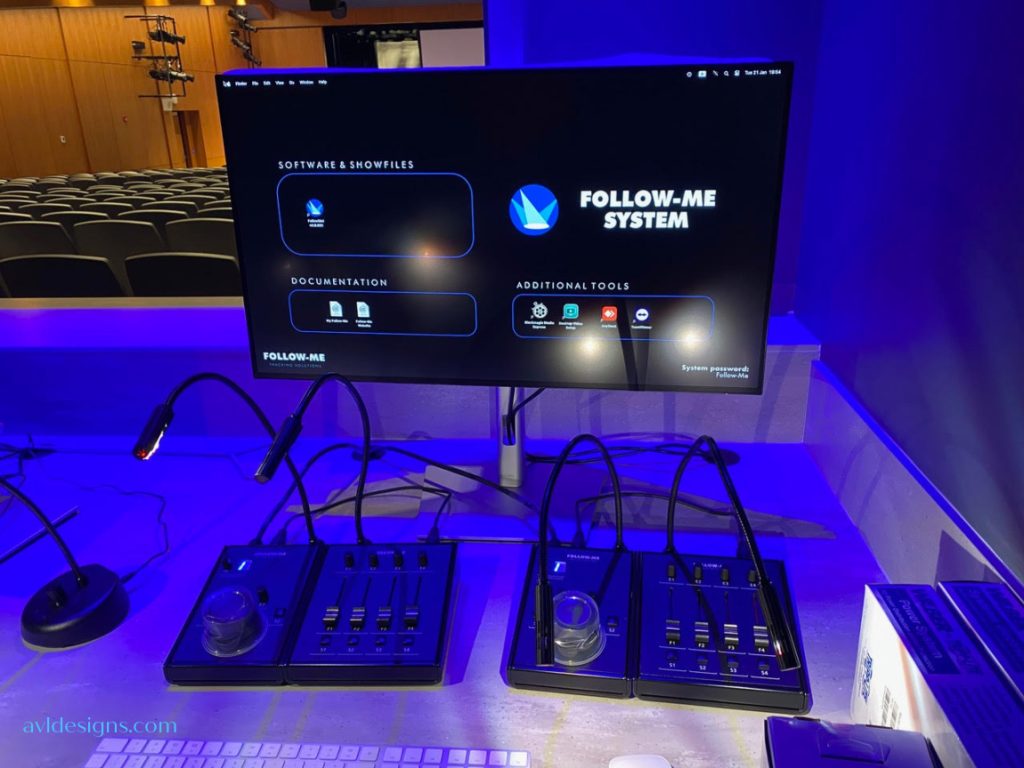 The follow-me system allows an operator in the booth to control motorized lighting fixtures utilizing a point-of-view camera to follow people on stage accurately.