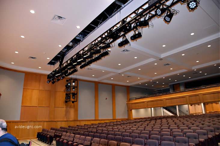 A front-of-house motorized truss has been added to make lighting more accessible, as opposed to the prior dead hung pipe system. Sidewall torms have been added to light the floor in front of the stage for choral and other uses.