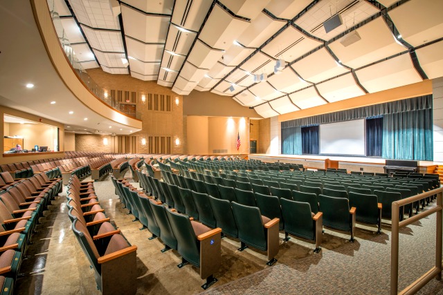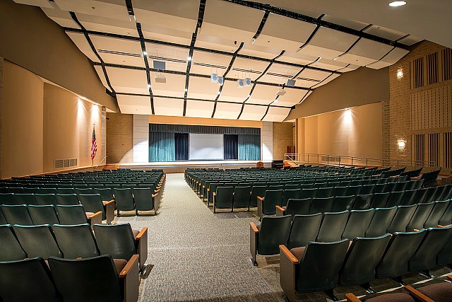 AVL Designs Inc. has been associated with the Vestal School District on past projects which include high school auditoriums and football fields. Working with BCK/IBI we were tasked with designing a new performance space for their new African Road School. This auditorium would be a primary performance space for the district for a variety of events. Acoustic design includes diffusive and reflective elements of many types, including the ceiling which was shaped specifically to provide energy distribution to the balcony in the rear seats. RPG diffuser block would be used extensively on the side walls to provide lateral energy. The sound system design consists of front fill, main seating area, and balcony “over and under” delay systems. Automated and manual controls are both available in the space. For day-to-day use operation is quite simple. For productions, it is run by an operator on a show console. AVL also provided design for all state rigging, theatrical and seating area lighting and audio visual presentation systems.