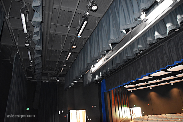 Acoustically, the challenge with this uniquely designed edifice – affectionately nicknamed “The Egg” – was to not allow the curves to generate echoes and other focused sound effects within the room. This was done with a variety of acoustically diffusive hard panels on the sidewalls and absorptive panels on the rear walls, working in conjunction with ceiling clouds to prevent focused energy and provide a good speech intelligibility into the seating area. The room is comprised of several types of systems: Audio: In order to be user friendly for the visiting performance groups, we incorporated a versatile digital audio setup with the capability of bringing in analog audio consoles and/or guest digital consoles that can tie in directly to the systems. Now any group coming in can use the in-house Allen and Heath systems, or it will work for them to be able to use their own. Lighting: This is all LED color changing and incorporates a variety of fixtures for a variety of purposes. Rigging: There is a dead-hung stage rigging system, including a motorized main curtain that closes across the curved front of the stage. Video: The room incorporates high-definition video projection, cameras, and other systems.