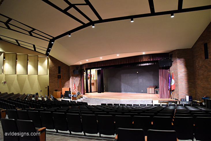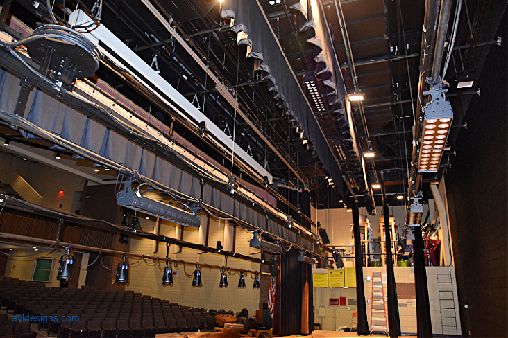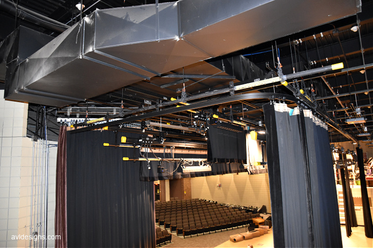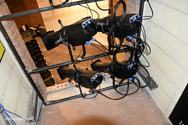 AVL Designs Inc.’s first task was to design new stage rigging which would be up to current stands and with as many moving pipes as possible. AVL utilized ETC FlyPipes to accomplish this task. A self-climbing package hoist allowed us to provide a safe, moving solution. The control of lighting and studio was in the balcony, which is not a great location for running a show, so a new control booth was included on the main floor to allow the audio and lighting crew to experience the show from the audience’s perspective. New AV systems included main speakers with over and under balcony delays to fill shadowed areas. A new digital console, wireless microphones, projector and screen, and controls were also included.