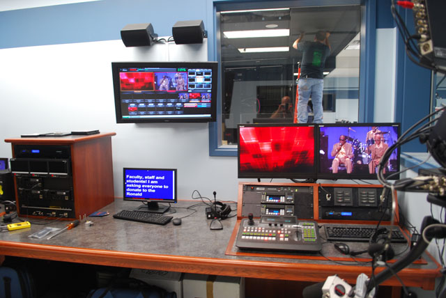 AVL was contracted by the Palmyra Macedon School District (PALMAC) to design new television studio facilities to allow both studio shooting and on site sports shooting live to air. Distances between the various sports venues (football field, gymnasiums, pool) and the studio exceeded 1500 feet. A fiber optic solution needed to be adopted to manage the long distances. Another requirement was to allow for on field live post game interviews with IFB fold back to the talent so they could hear prompting from the studio as well as confidence monitoring of the microphones in use. This was accomplished with digital audio connections from the studio to the remote locations with Aviom remote controls on the field end. Digital Fiber Optic Camera systems Green Screen 3D Studio with Hard Cyc Green Screen Weather Set Teleprompters and Confidence Monitors Live Sports Graphics Offline GFX Broadcast Pix Switcher Studio Pipe Grid and Lighting control Audio including IFB Fiber optic connection to multiple venues with IFB and remote monitor for cameras Building wide IP distribution Direct connection