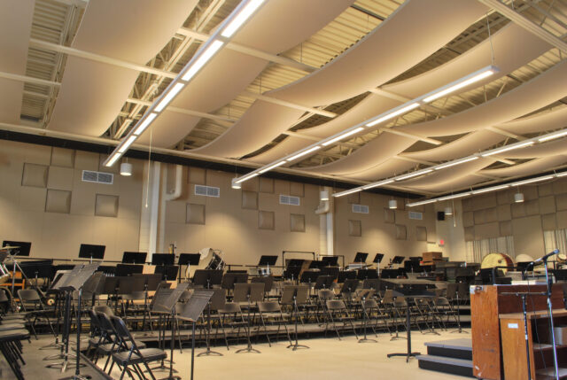 In the design phase of multiple rehearsal spaces for the Phoenix Central School District, the architect wanted a dramatic look along with good acoustical conditions. The budget they had to work with was somewhat tight. We used a combination of off-the-shelf wall products and a custom GRG acoustical canopy for each space. The acoustical canopy allows energy to be distributed back to the musicians while some of it is generated up to an acoustic roof deck above. Walls products include diaphragmatic units that help control low frequencies. A combination of RPG formed fussors as well as kinetics barrel diffusers and absorbers of various thicknesses were used to tune the rooms.